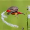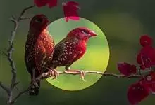 红梅花雀小型鸟类,体长9-10厘米。雄鸟通体朱红色,背、肩、胸等满布白色小斑点,两翅和尾黑褐色均具白色端斑,嘴红色,脚蜡黄色。雌鸟上体淡褐色或赭褐色,翅上中覆羽、大覆羽和内侧飞羽末端具白色斑点,…全部>>