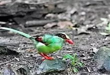 蓝绿鹊:中型鸟类,共有5个亚种。体长36-38厘米。尾长,嘴、脚红色。通体羽色主要为草绿色,宽阔的黑色贯眼纹向后延伸到后颈,在绿色的头侧极为醒目。两翅栗红色,内侧飞羽具黑色次端斑和白色尖端。尾绿色,…全部>>