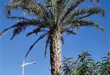 加那利海枣是棕榈科刺葵属植物,单干直立,自然高度可达18米,干径50-90厘米,幼时被以枯叶,老树则叶柄基部残存。具波状叶痕,羽状复叶,顶生丛出。雌雄异株,肉穗花序自叶间抽出,长可达2米。浆果,…全部>>