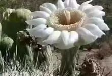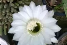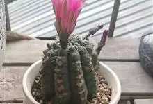 仙人球花 仙人掌科,仙人球属。植株单生或成丛。幼株球形,老株长成圆筒状,高可达75厘米,直径12-15厘米。球体暗绿色,具棱11-12。刺锥状,黑色,长1-1.5厘米。花着生于球体侧方,大型嗽喇叭状…全部>>