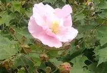 木芙蓉,锦葵科木槿属落叶灌木或小乔木。小枝上有细绒毛;叶片为卵状心形,托叶为披针形,常早落;花单生,花萼为钟形,花冠初为白色或淡红色,后逐渐变为深红色;果实为扁球形,有淡黄色的毛附着。花期8到10月。…全部>>