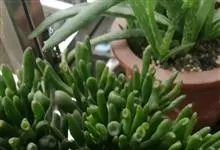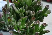 筒叶花月,是景天科青锁龙属的多年生草本植物。植株多分株,灌木状,茎较粗壮,圆柱形,表皮灰褐色;叶片肉质,互生,呈圆筒状,簇生于茎或分枝顶端,叶端呈斜截形,截面为椭圆形;花呈星状,淡白色;花期秋季。…全部>>