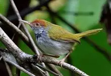 普通缝叶莺,是雀形目鹅科莺亚科缝叶莺属一种。体长10-14厘米,体重7-10克,雄鸟前额棕红,头顶至枕棕橄榄褐,上体橄榄绿染黄,飞羽及尾羽暗褐;繁殖期雄鸟的中央尾羽特形延长,下体淡皮黄白色。…全部>>