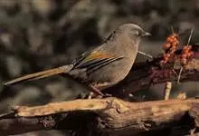橙翅噪鹛:是噪鹛科、彩翼噪鹛属的中型鸟类,体长22-25厘米。头顶深葡萄灰色或沙褐色。上体灰橄榄褐色,外侧飞羽外翈蓝灰色、基部橙黄色,中央尾羽灰褐色,外侧尾羽外翈绿色而缘以橙黄色并具白色端斑。…全部>>