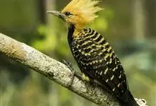 三趾啄木鸟,是啄木鸟科、啄木鸟属的小型鸟类,体长20-23厘米,雄鸟头顶金黄色,雌鸟黑色而具白色斑点。眼至耳覆羽黑色,眼后有一条白色纵纹,颊纹白色,颚纹黑色,甚为醒目。枕和后颈黑色,…全部>>