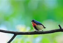 红胸啄花鸟:体重5-10克,体长60-92毫米。体形纤小。雄鸟上体呈辉亮的金属绿色;下体棕黄,胸部具一朱红色块斑,极易与其他啄花鸟区别。雌鸟上体呈橄榄绿,下体棕黄色。虹膜褐色,嘴褐黑色或角灰色,…全部>>