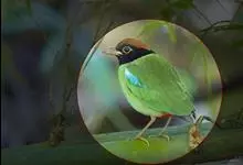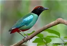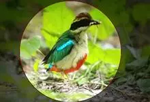 绿胸八色鸫:是雀形目八色鸫科的鸟类,共有12个亚种。体长为16-18厘米,体重65-69克。体型圆胖,尾短,腿长。头黑,上体绿色,两翼深色而具白色斑纹,头顶至后枕深褐,胸及腹部苹果绿,臀亮红。…全部>>