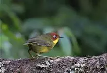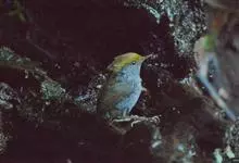 金冠地莺:形态与灰腹地莺相似,上体橄榄绿,前额至头顶渲染亮金黄色;下体几乎纯暗石板灰色,下嘴基部橙红色或橙黄色。虹膜褐色;上嘴角褐色,下嘴基部橙红色或深橙黄色直至嘴尖;跗跖和趾褐色,爪褐色。…全部>>