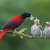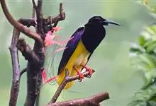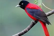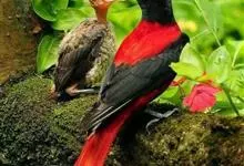 朱鹂:中等鸟类,体长23-28厘米。雄鸟绛紫红色,头、上胸及翼黑色。雌鸟上背及背部深灰色,尾覆羽及尾绛紫红色,腹部及下胸白而密布黑色纵纹。与鹊色鹂幼鸟的区别在上背灰色较深,下体白色较少且纵纹较粗。…全部>>