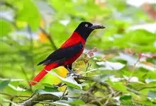 朱鹂:中等鸟类,体长23-28厘米。雄鸟绛紫红色,头、上胸及翼黑色。雌鸟上背及背部深灰色,尾覆羽及尾绛紫红色,腹部及下胸白而密布黑色纵纹。与鹊色鹂幼鸟的区别在上背灰色较深,下体白色较少且纵纹较粗。…全部>>