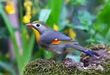 银耳相思鸟小型鸟类,体长14~18厘米。头顶黑色,耳羽银灰色,前额橙黄色;外侧飞羽橙黄色,基部朱红色,极为鲜艳、醒目。尾圆形,尾上、尾下覆羽朱红色,尾暗灰褐色,外侧尾羽橙黄色,其余上体橄榄绿或橄榄黄色。…全部>>