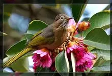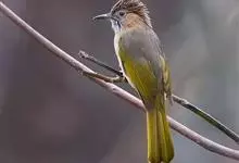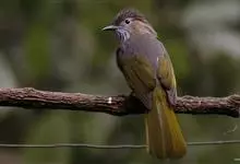 灰短脚鹎,体长19-22厘米。头顶和短的羽冠黑色,上体暗灰色,耳羽灰褐色,两翅表面橄榄绿黄色。大覆羽和内侧飞羽外翈橄榄黄色,在翅上形成大块绿黄色斑,在灰色的上体极为醒目。尾暗褐色具橄榄绿色羽缘。…全部>>