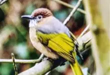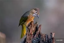 灰短脚鹎,体长19-22厘米。头顶和短的羽冠黑色,上体暗灰色,耳羽灰褐色,两翅表面橄榄绿黄色。大覆羽和内侧飞羽外翈橄榄黄色,在翅上形成大块绿黄色斑,在灰色的上体极为醒目。尾暗褐色具橄榄绿色羽缘。…全部>>