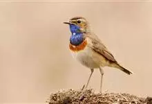 蓝点颏亦称“蓝喉歌鸲”,通称蓝靛颏儿。身体大小和麻雀相似,体长12-13厘米,体重17-18克。头部、上体主要为土褐色。眉纹白色。尾羽黑褐色,基部栗红色。颏部、喉部辉蓝色,下面有黑色横纹。下体白色。…全部>>