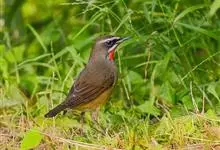 红尾歌鸲:体长13-15厘米。上体橄榄褐色。尾羽棕栗色,眼先和颊黄褐色,眼周淡黄褐色。下体颏、喉污灰白色,微沾皮黄色,胸部具橄榄色扇贝形纹,两胁橄榄灰白色,腹部和尾下覆羽与颏、喉同。尾部棕色。…全部>>