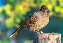 条纹噪鹛是画眉科、噪鹛属中型鸟类,体长28-32厘米。头具短的羽冠,上体栗褐色,飞羽外翻蓝灰色。下体棕栗色,腹以后转为褐白色。除飞羽和尾羽外,所有上、下体羽均具白色羽干纹。极为醒目。野外特征明显,…全部>>