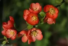 贴梗海棠 Nakai)是蔷薇科、木瓜海棠属植物。落叶灌木,高达2米,枝条直立开展,有刺。叶片卵形至椭圆形,稀长椭圆形,长3-9厘米,宽1.5-5厘米。花先叶开放,3-5朵簇生于二年生老枝上。…全部>>