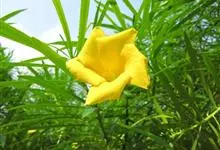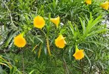 黄花夹竹桃K. Schum.),又名“酒杯花”“柳木子”“黄花状元竹”,是夹竹桃科,黄花夹竹桃属下的常绿乔木植物。高达5m,全株无毛,树皮棕褐色;叶互生,近革质,线形或线状披针形;花大,黄色,具香味,…全部>>