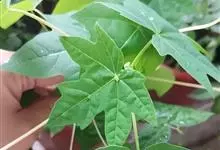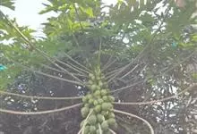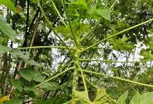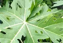 番木瓜,番木瓜科番木瓜属的常绿软木质小乔木,高达10米,具有乳汁;茎不分枝或有时于损伤处分枝;叶大且聚生于茎顶,近似盾形,叶柄中空;花单性或两性,有些品种雄株偶尔生两性花或雌花,…全部>>