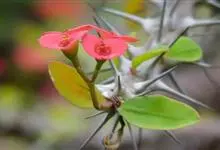 虎刺梅:别称铁海棠,是蔓生灌木植物。茎多分枝,长60-100厘米,直径5-10毫米,具纵棱,密生硬而尖的锥状刺,刺长1-1.5厘米,直径0.5-1.0 毫米,常呈3-5列排列于棱脊上,呈旋转。叶互生…全部>>