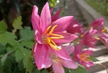 小韭兰学名韭菜莲又名风雨花、菖蒲莲、红玉帘和旱水仙,多年生草本,鳞茎卵球形,基生叶常数枚簇生,线形,扁平,花单生于花茎顶端,下有佛焰苞状总苞,花玫瑰红色或粉红色,蒴果近球形,种子黑色,花期夏秋。韭莲…全部>>