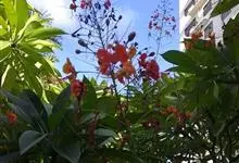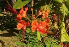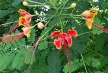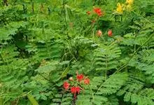 洋金凤 Sw.),豆科小凤花属灌木状或小乔木植物,枝无毛,绿或粉绿色;二回羽状复叶;总状花序伞房状,萼片无毛,花瓣橙红或黄色,圆形,花丝红色,子房无毛,花柱橙黄色;荚果窄而薄,…全部>>