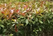 石楠 Kalkman),是蔷薇科石楠属的常绿乔木,高5~12米,株型紧凑,树冠圆球形。树枝为褐灰色;鳞片为褐色,没有毛;叶片革质,长椭圆至侧卵状椭圆形,有锯齿,新叶红色光亮。复伞房花序,白色小花,…全部>>