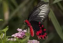 曙凤蝶是凤蝶科、曙凤蝶属蝴蝶。体背黑色,头、颈、胸侧及腹侧具红色鳞毛。雌、雄异型。雄蝶翅黑绒色,后翅的臀缘褶很大,反卷且具灰白色体毛的性标。雌蝶前翅大部及后翅色淡,…全部>>