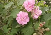 木芙蓉,锦葵科木槿属落叶灌木或小乔木。小枝上有细绒毛;叶片为卵状心形,托叶为披针形,常早落;花单生,花萼为钟形,花冠初为白色或淡红色,后逐渐变为深红色;果实为扁球形,有淡黄色的毛附着。花期8到10月。…全部>>