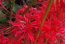 石蒜[学名:Lycoris radiata Herb.],是石蒜科石蒜属的多年生草本植物,别名彼岸花、红花石蒜、死人花、蟑螂花、龙爪花等。石蒜的叶狭带状,中间有粉绿色带,秋季出叶。伞形花序,花鲜红色。…全部>>