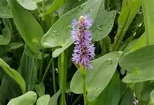 梭鱼草是雨久花科,梭鱼草属多年生挺水或湿生草本植物,株高可达150厘米,地茎叶丛生,圆筒形叶柄呈绿色,叶片较大,深绿色,表面光滑,叶形多变,但多为倒卵状披针形。花葶直立,通常高出叶面,穗状花序顶生,…全部>>