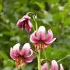 东北百合,别名卷莲花、老哇芋头、轮叶百合、伞蛋花、山丹花,为百合科、百合属多年生球根花卉。鳞茎卵圆形,白色,有节。苞片叶状,花淡橙红色,具紫红色斑点;花被片稍反卷,蒴果倒卵形,花期7-8月,果期9月,…全部>>