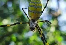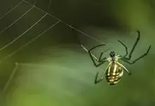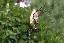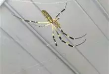 棒络新妇,是蜘蛛目肖蛸科络新妇属节肢动物。雄蛛体长约6毫米,背甲褐色,具黑色纵斑;步足黑色,有橙色环纹;腹部筒形、褐色,有黄斑;雌蛛体长约21毫米,背甲黑色,有大量银色长毛;触肢黄色,步足黑色,…全部>>