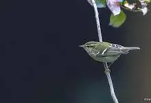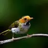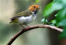 棕脸鹟莺:体长10厘米,是一种色彩亮丽而有特色的莺鸟。头栗色,具黑色侧冠纹。上体绿,腰黄色。下体白,颏及喉杂黑色点斑,上胸沾黄。与栗头鹟莺的区别在头侧栗色,白色眼圈不显著且无翼斑。…全部>>