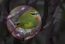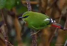 火尾绿鹛是莺科、绿鹛属小型鸟类,体长11-14厘米。上体绿色,头顶至枕具黑色鳞状斑,眼先和眼后黑色,眉纹黄绿色。两翅黑色具黄色和红色翅斑及白色端斑,极为醒目。中央一对尾羽绿色,外侧尾羽鲜红色。…全部>>