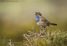 蓝点颏亦称“蓝喉歌鸲”,通称蓝靛颏儿。身体大小和麻雀相似,体长12-13厘米,体重17-18克。头部、上体主要为土褐色。眉纹白色。尾羽黑褐色,基部栗红色。颏部、喉部辉蓝色,下面有黑色横纹。下体白色。…全部>>