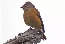 棕尾褐鹟:体重9-16克;体长109-122毫米,是一种体型略小的红褐色鹟。眼圈皮黄,喉块白,头石板灰色,背褐,腰棕色,下体白,胸具褐色横斑,两胁及尾下覆羽棕色。通常具白色的半颈环。…全部>>