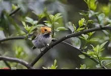 黑脸鹟莺:体长10厘米,是有特色的体小而多彩的莺鸟。粗眉纹,颏、喉及尾下覆羽黄色,脸罩黑,头顶及颈背灰色,上体绿,无翼纹,腹白。虹膜褐色;上嘴色深,下嘴肉色;脚偏绿色。…全部>>