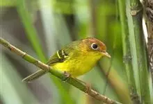 棕脸鹟莺:体长10厘米,是一种色彩亮丽而有特色的莺鸟。头栗色,具黑色侧冠纹。上体绿,腰黄色。下体白,颏及喉杂黑色点斑,上胸沾黄。与栗头鹟莺的区别在头侧栗色,白色眼圈不显著且无翼斑。…全部>>