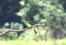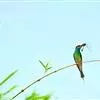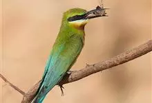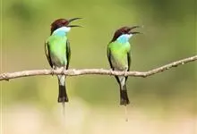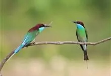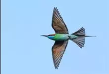 蓝喉蜂是蜂虎科蜂虎属鸟类。体长26-28厘米,嘴长而弯曲,有明显细长的中央尾羽。头部、颈部和背部为巧克力色,有黑色眼纹。喉部、腰部和尾羽为蓝色。腹部和两翼为绿色。幼鸟外观似成鸟,头部、颈部和背部为绿色,…全部>>