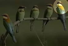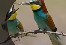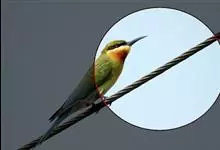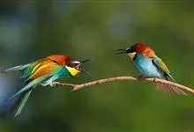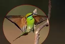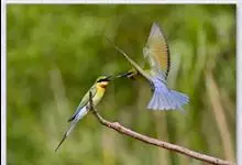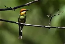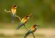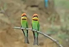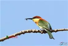 栗喉蜂虎是蜂虎科蜂虎属的鸟类。有热带鸟类羽毛艳丽的特征:喉部是栗红色的,黑色的过眼纹,翅膀和背部是绿色的,尾翼是蓝色的,飞行时翅膀下面的羽毛是橙黄色的,在阳光的照射下,它们全身闪烁着金属般的艳丽光泽,…全部>>
