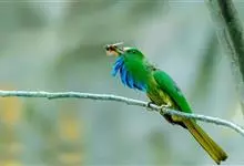 蓝须夜蜂虎是佛法僧目、蜂虎科的鸟类,体长约30厘米,是绿色林栖型蜂虎,蓝色的胸羽蓬松,嘴厚重而下弯。成鸟顶冠淡蓝,腹部棕黄带绿色纵纹。尾羽腹面黄褐。亚成鸟全身绿色。喉、胸部中央的羽甚长和亮色;该物种…全部>>