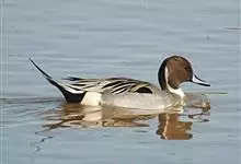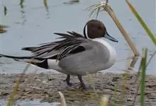针尾鸭,是雁形目鸭科鸭属动物。体长约75厘米的大型戏水鸭,雄鸟头暗褐色,颈侧有白色纹路,向下与胸部白色相连,中央一对尾羽特别长;背灰色,有黑色细纹;翼镜绿色,胸腹白色,尾下覆羽黑色;雌鸟体羽大致为褐色,…全部>>