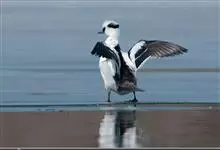 斑头秋沙鸭,是鸭科、斑头秋沙鸭属鸟类。雄鸟眼先和眼周黑色,成块斑状;头部其余部分全为白色。颈白色;背黑色,上背最前处的白羽具有黑端,相连而成两条半圆环狭带。下体白色,体侧羽毛具黑褐色波状细纹。…全部>>