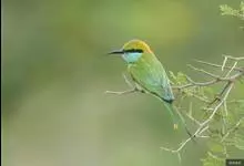 绿喉蜂虎是佛法僧目、蜂虎科的小型鸟类,共有9个亚种。身长22-25厘米,翼展29-30厘米,体重15-20克。喉绿色,额部、头顶至上背为锈红色,其余上体均为亮绿色。中央尾羽延长且端段狭细,…全部>>