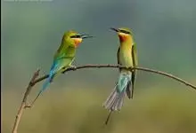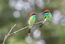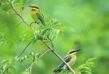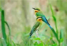 蓝喉蜂是蜂虎科蜂虎属鸟类。体长26-28厘米,嘴长而弯曲,有明显细长的中央尾羽。头部、颈部和背部为巧克力色,有黑色眼纹。喉部、腰部和尾羽为蓝色。腹部和两翼为绿色。幼鸟外观似成鸟,头部、颈部和背部为绿色,…全部>>