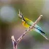黄喉蜂虎属中型鸟类,体长23-30厘米。喉黄色,其下有一窄的黑色胸带;胸带以下的整个下体蓝绿色。前额蓝白色,具一宽的黑色贯眼纹,头顶至后颈暗栗色,尾蓝绿色,中央尾羽延长,明显突出于其他尾羽。…全部>>