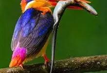 蓝翠鸟:体长17-19厘米,翼展25-29厘米,体重40克。体羽艳丽而具光辉,头、背羽蓝色有光泽,胸腹部是美丽明亮的桔红色或红棕色,翅膀上夹有一些黑色,后颈和喉部有白斑,尾下尖部是斑驳的灰黑色,腿和…全部>>