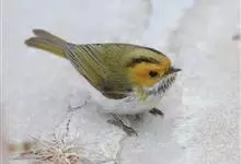 黑脸鹟莺:体长10厘米,是有特色的体小而多彩的莺鸟。粗眉纹,颏、喉及尾下覆羽黄色,脸罩黑,头顶及颈背灰色,上体绿,无翼纹,腹白。虹膜褐色;上嘴色深,下嘴肉色;脚偏绿色。…全部>>