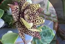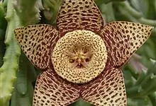 巨花犀角又称大豹皮花,是夹竹桃科犀角属的一种植物。茎粗,花大,边缘生长细毛。植株柱形多分枝呈丛生,柱形具4棱,棱缘具细小疣突。花大,五角星形黄色,并有横向棕褐色斑纹,似豹皮而得名。花期夏秋两季。…全部>>